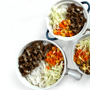 Hearty and flavorful rice bowls topped with savory proteins, fresh veggies, and delicious sauces, perfect for a quick and satisfying meal.