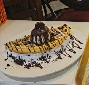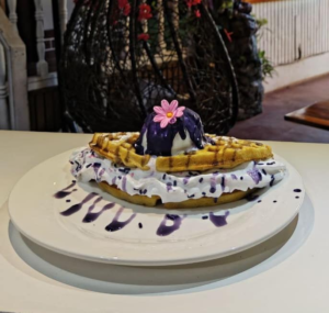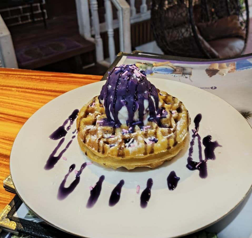 A uniquely delicious treat with fluffy waffles topped with smooth ube spread, whipped cream, and a drizzle of ube syrup for the perfect balance of flavor and sweetness.